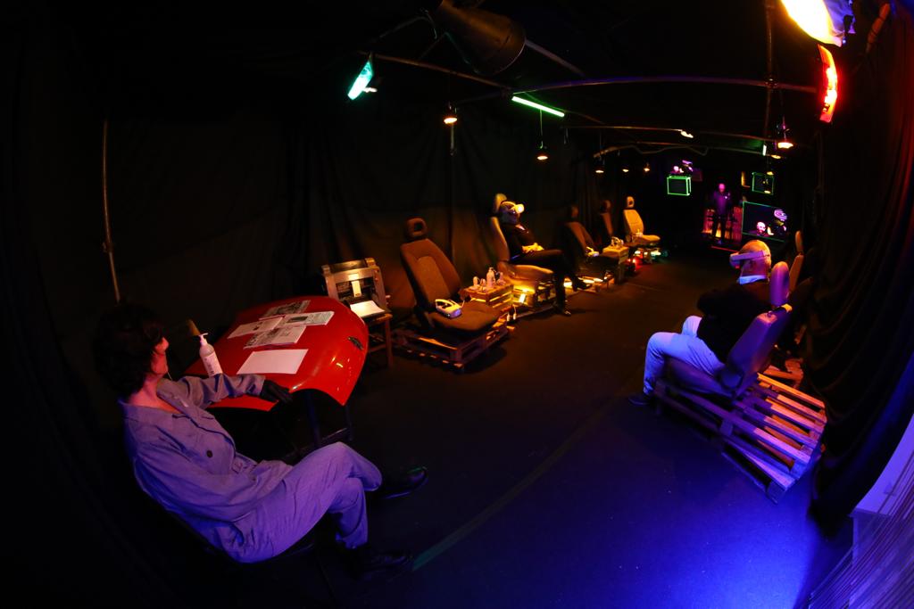 Shock in my town is a performance that aims to incorporate the thematic element of false social consciousness within a dramaturgical and scenic device that crumbles the covenant of suspension of disbelief.